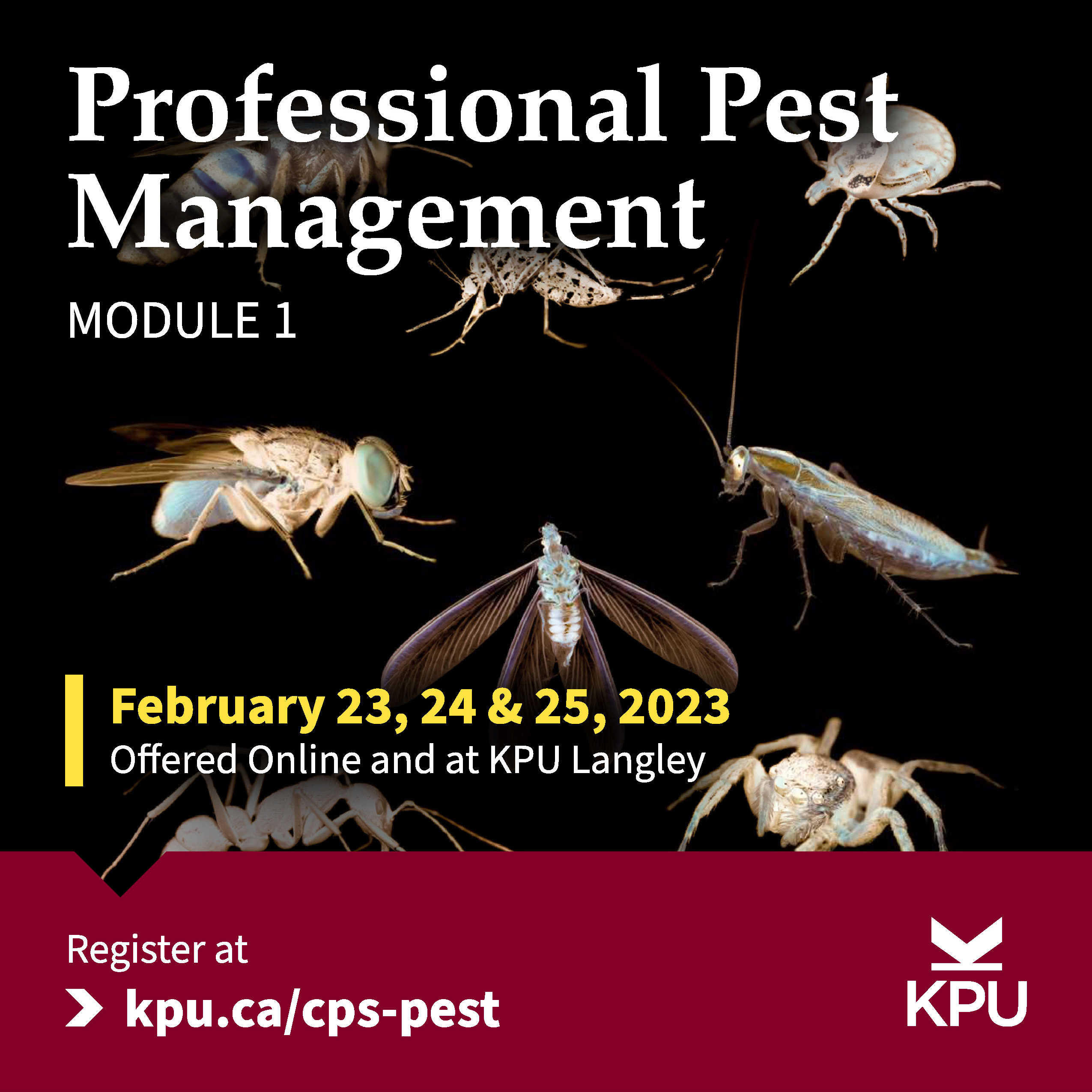 Kwantlen Polytechnic University’s School of Horticulture is offering the Professional Pest Management (PPM) Module 1 from Nov. 23 to 25, 2023. This course is designed to provide up-to-date training in the technical aspects of pest management, quality assurance, and customer care to upgrade your professional industry development or meet continuing education (CE) credit requirements.